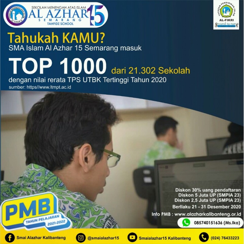 Sebagaimana diketahui bahwa UTBK adalah tes masuk perguruan tinggi yang diselenggarakan oleh Lembaga Tes Masuk Perguruan Tinggi (LTMPT). Predikat Top 1000 diumumkan secara terbuka di website resmi LTMPT https://www.ltmpt.ac.id/. Saat ini para lulusan SMA Islam Al Azhar 15 Semarang telah diterima di perguruan tinggi favorit baik negeri maupun swasta terkemuka, termasuk UGM, Undip, Unnes, UIN Walisongo, dan lainnya. Seluruh civitas akademika SMA Islam Al Azhar 15 Semarang mengucapkan terima kasih dan turut bangga atas capaian prestasi yang telah ditorehkan para alumni Angkatan II teriring doa semoga para alumni dapat terus menjadi pribadi yang beriman, sehat, mandiri, berakhlakul karimah, religius, terampil, dan berwawasan global. Aamiin. Salam Be Smart Go.